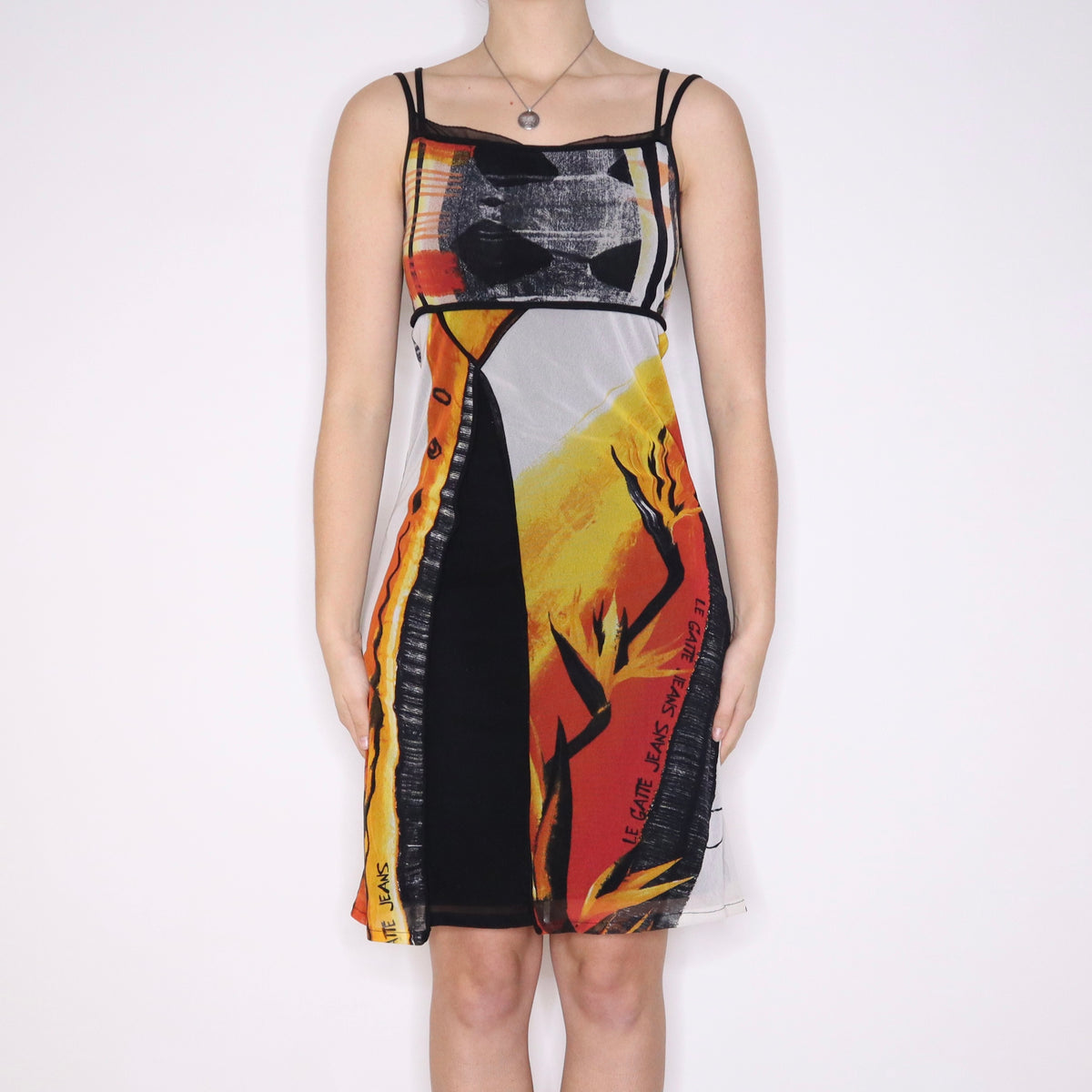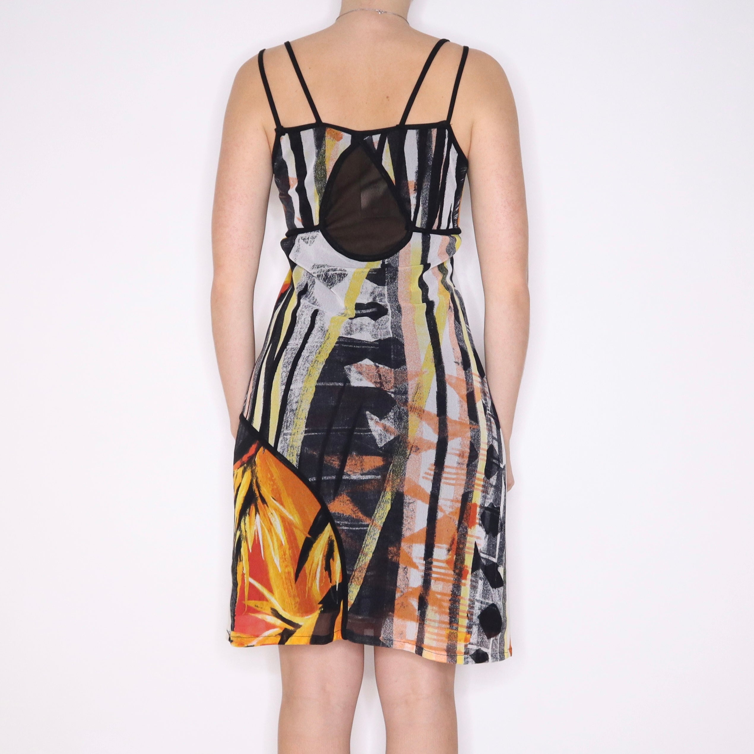 Y2K Italian Designer Abstract Print Mesh Dress (M)