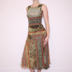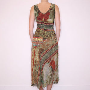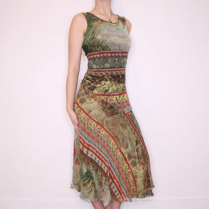 Model is 5’9” and a size S to M. This dress fits loose on her.
