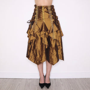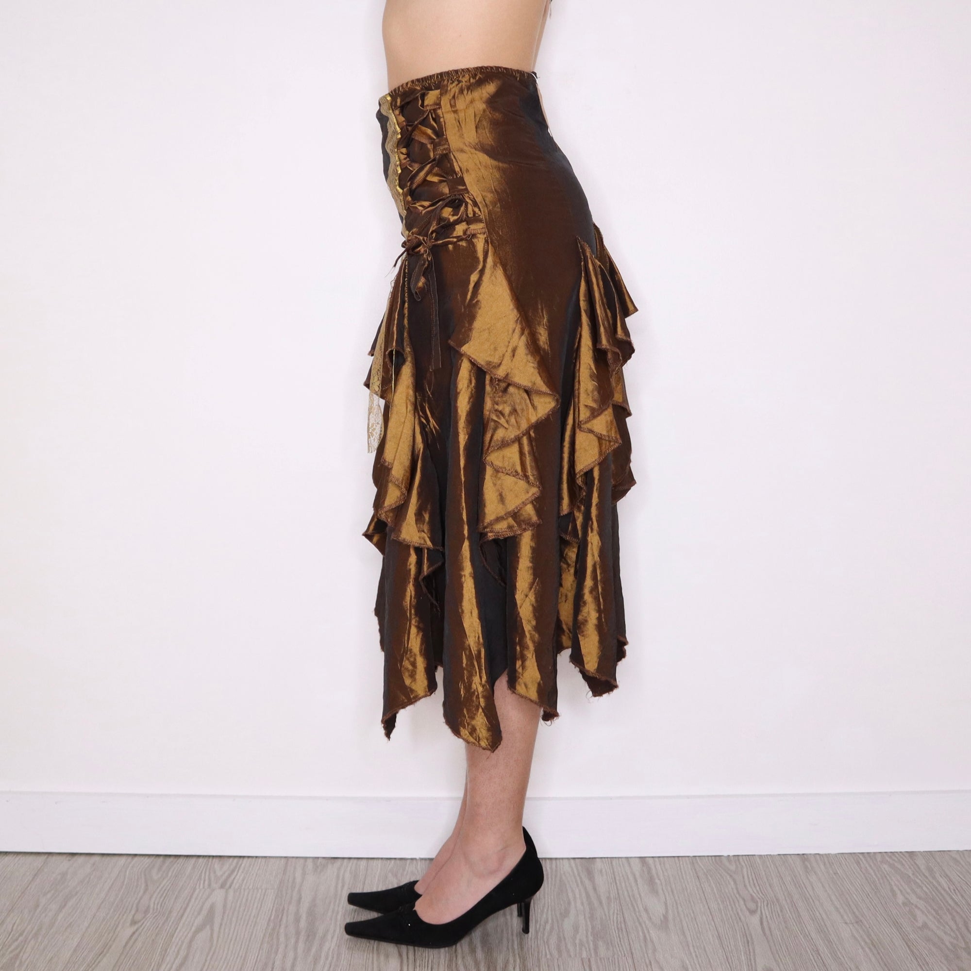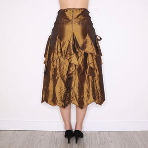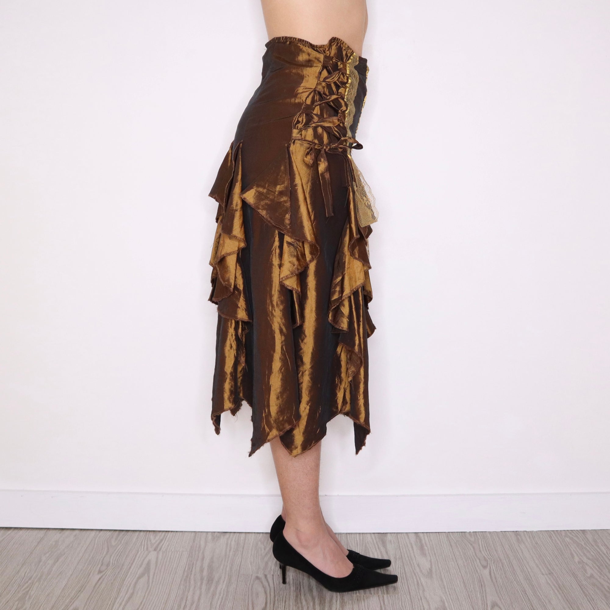 Y2K Brown Silk Ruffle Corset Maxi Skirt (S)