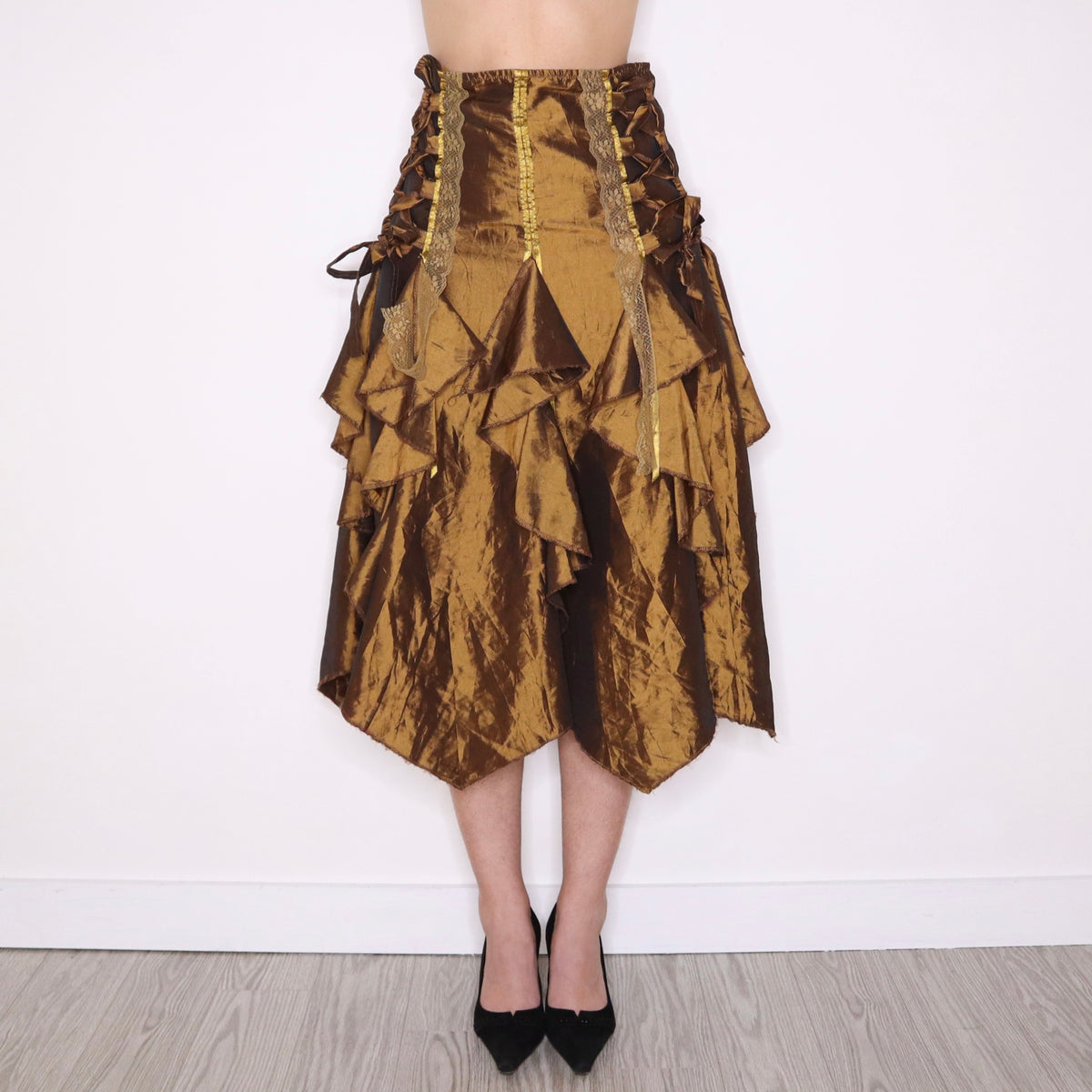 Y2K Brown Silk Ruffle Corset Maxi Skirt (S)