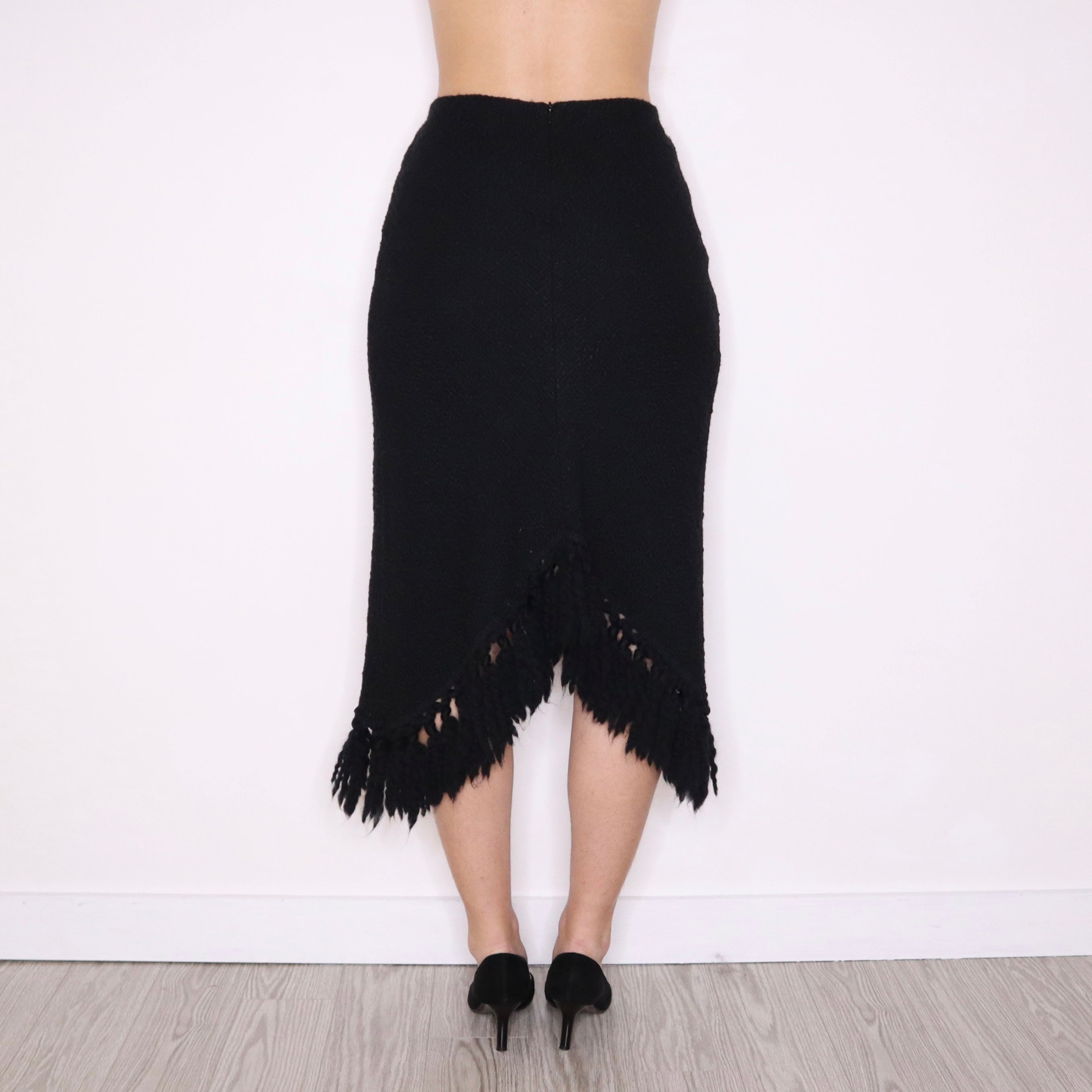 90s Italian Black Wool Fringe Maxi Skirt (S)