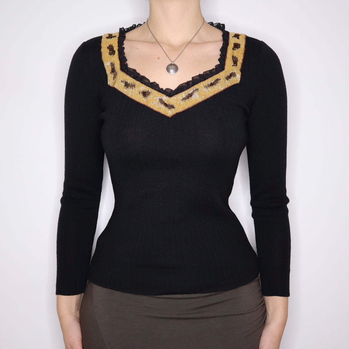 Y2K Brown Beaded Long Sleeve Top (S)