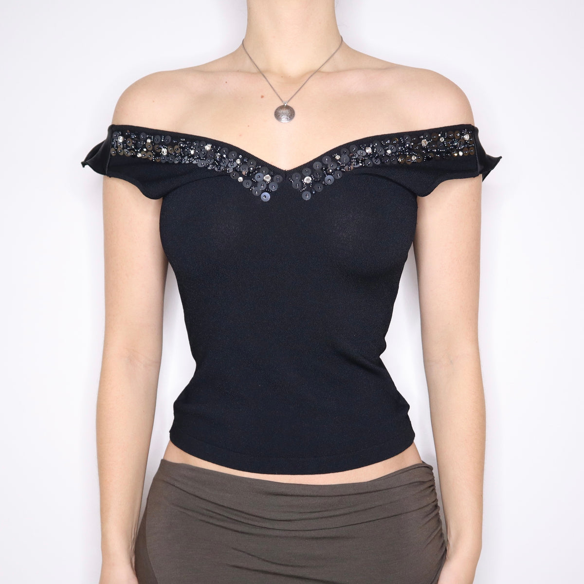 Y2K Italian Black Beaded Sequin Top (S/M)