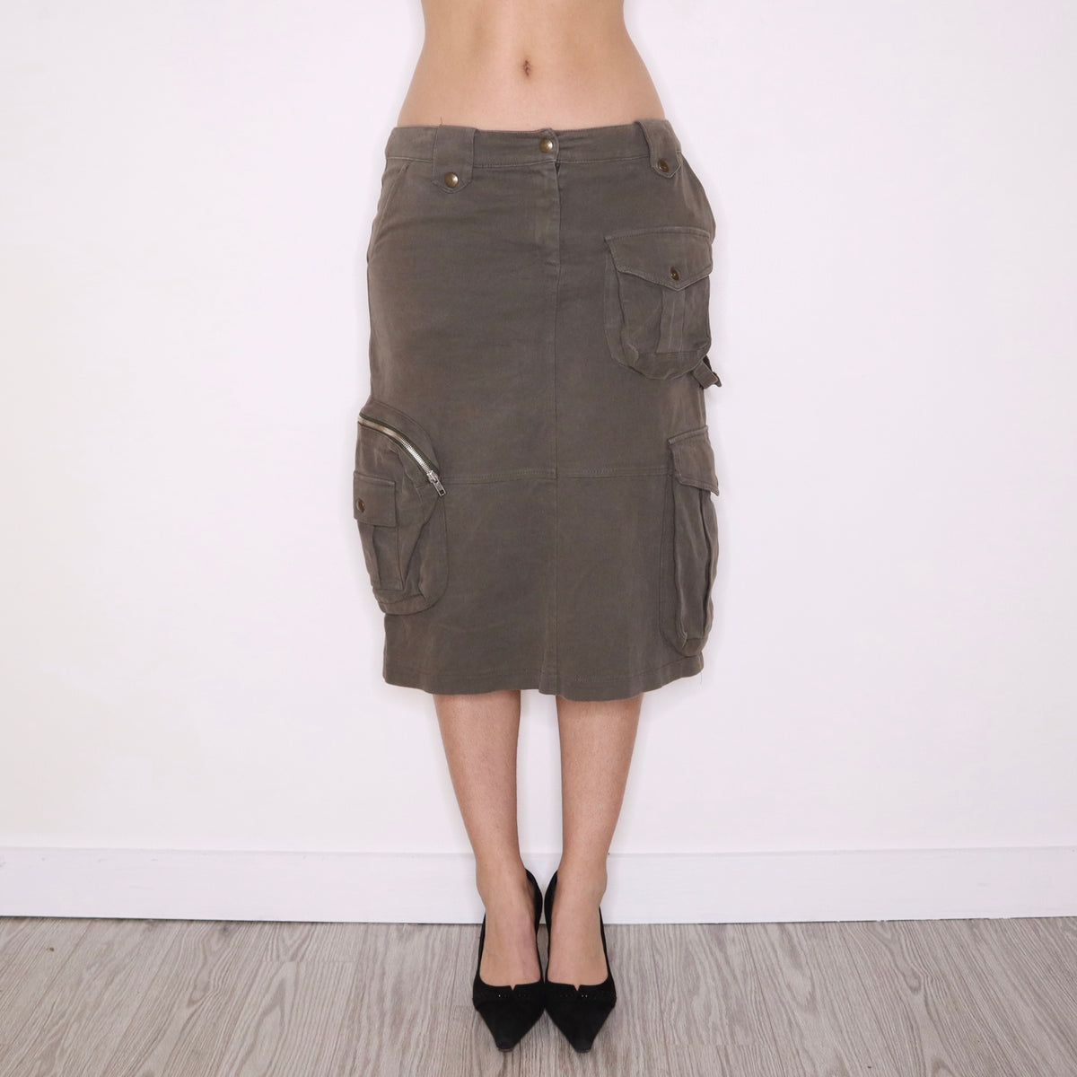 Y2K Italian Khaki Green Cargo Midi Skirt (M)
