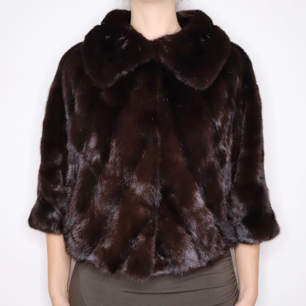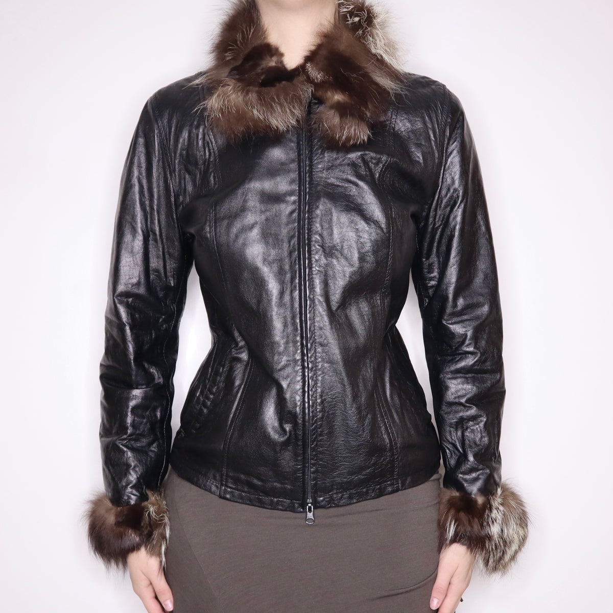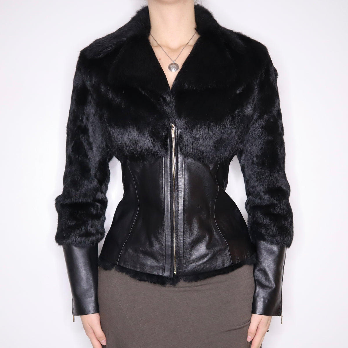 Y2K Black Rabbit Fur and Leather Coat (M)