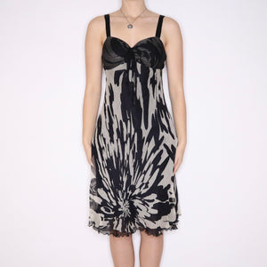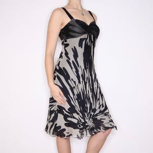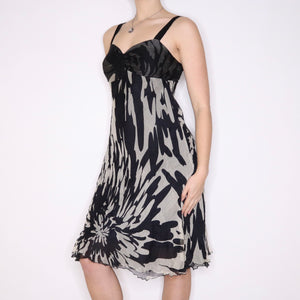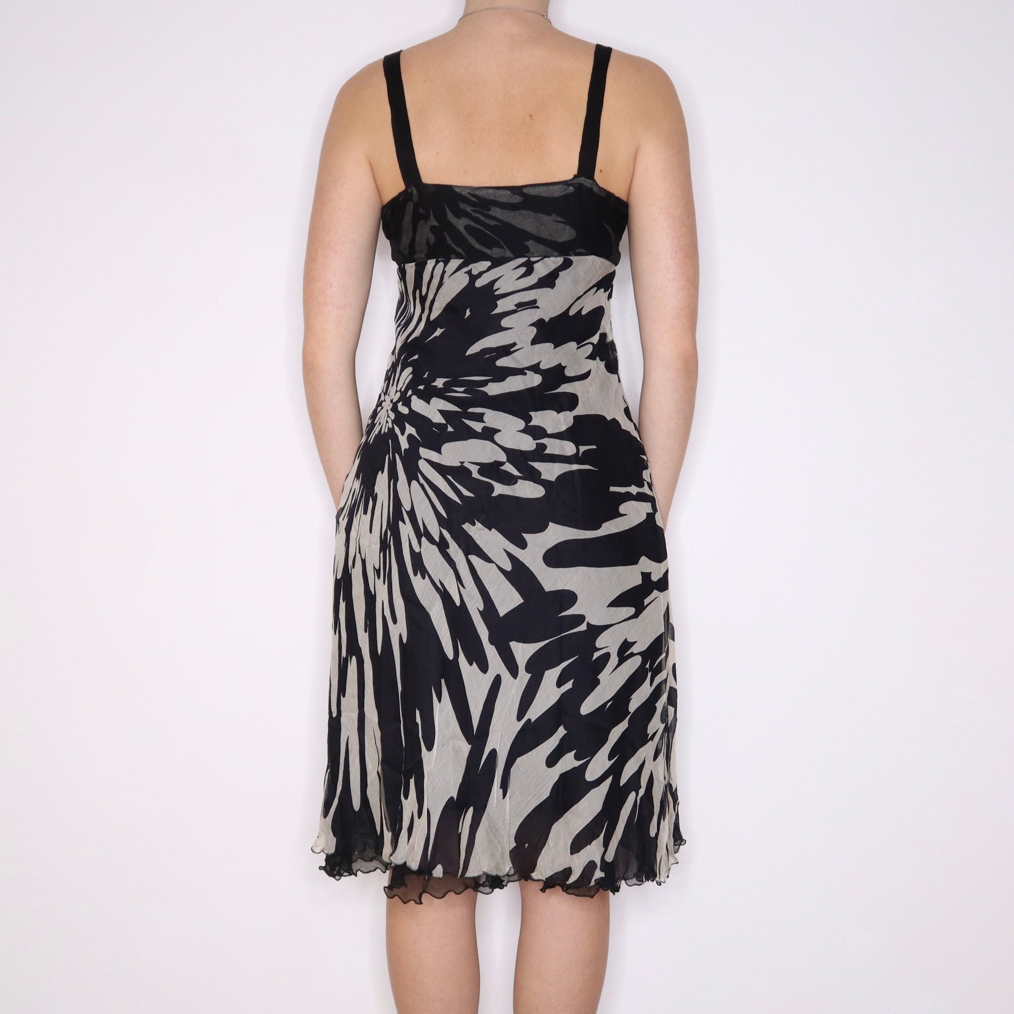 Y2K Italian Silk Black and White Floral Midi Dress (M)