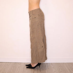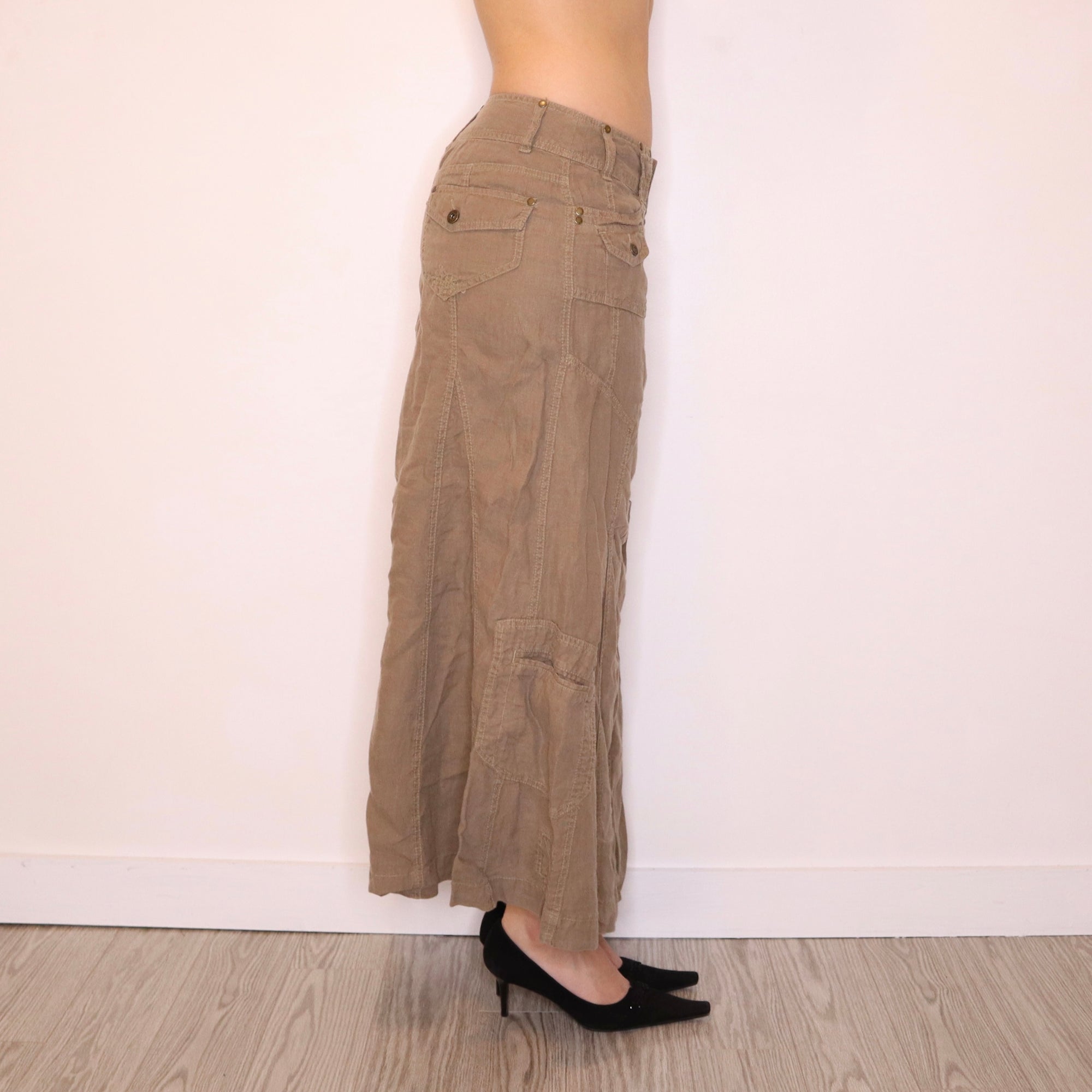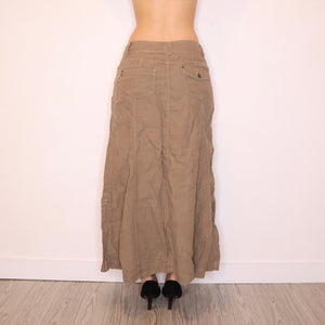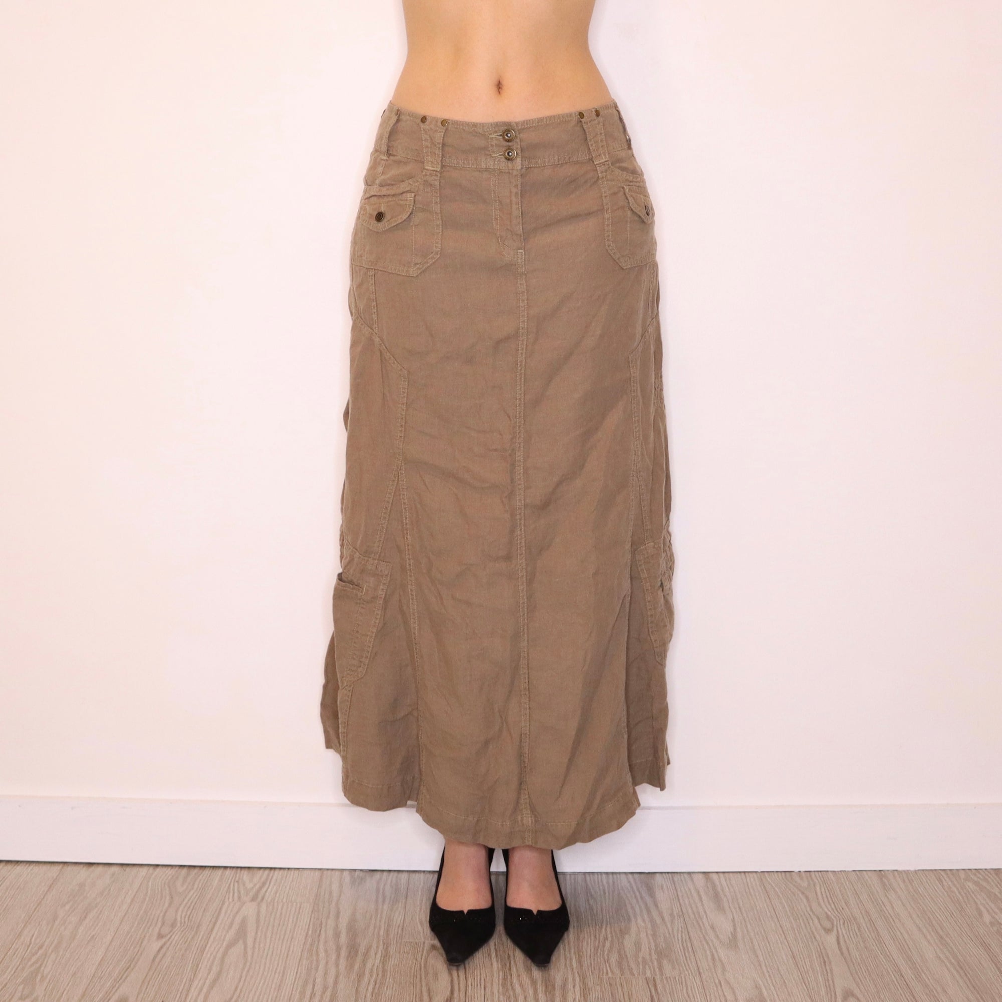 Model is 5’9” and a size S to M. This skirt fits well on her.