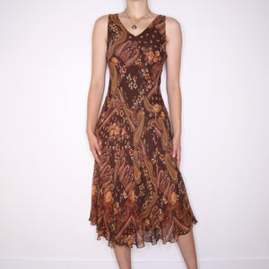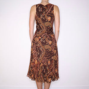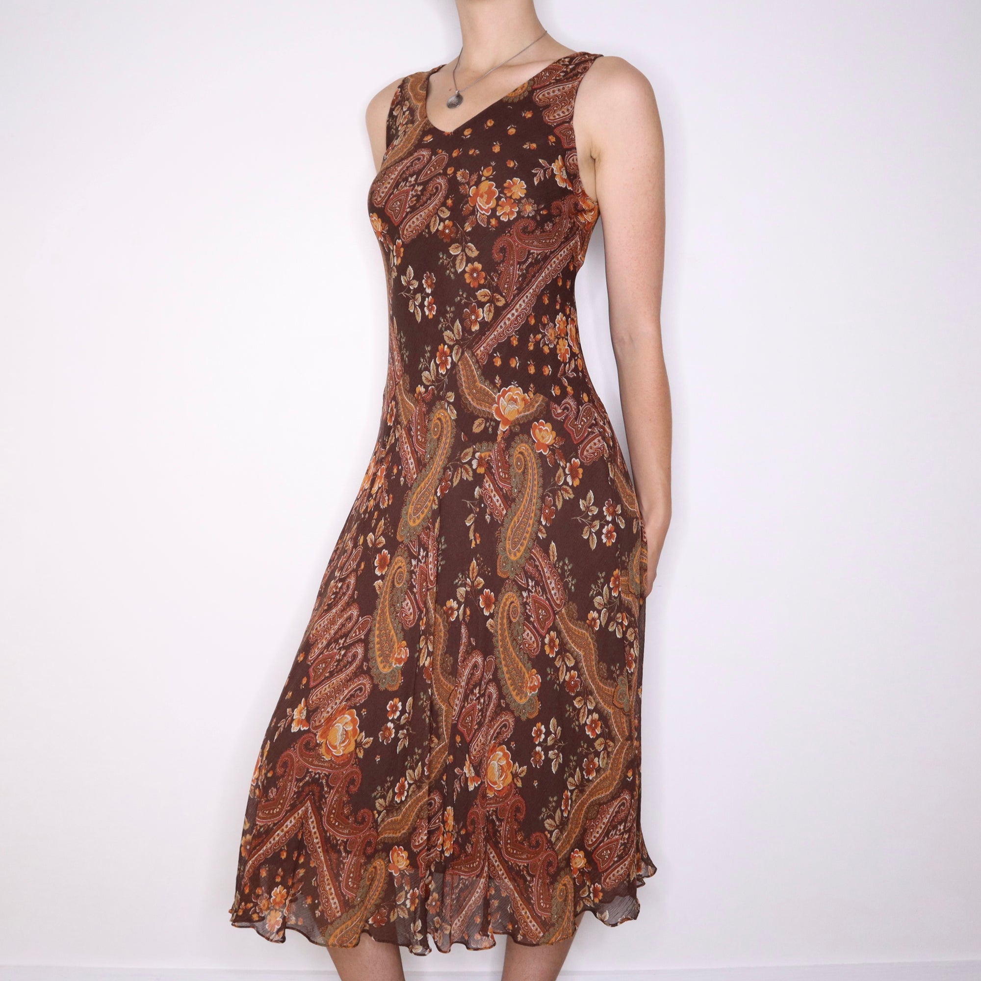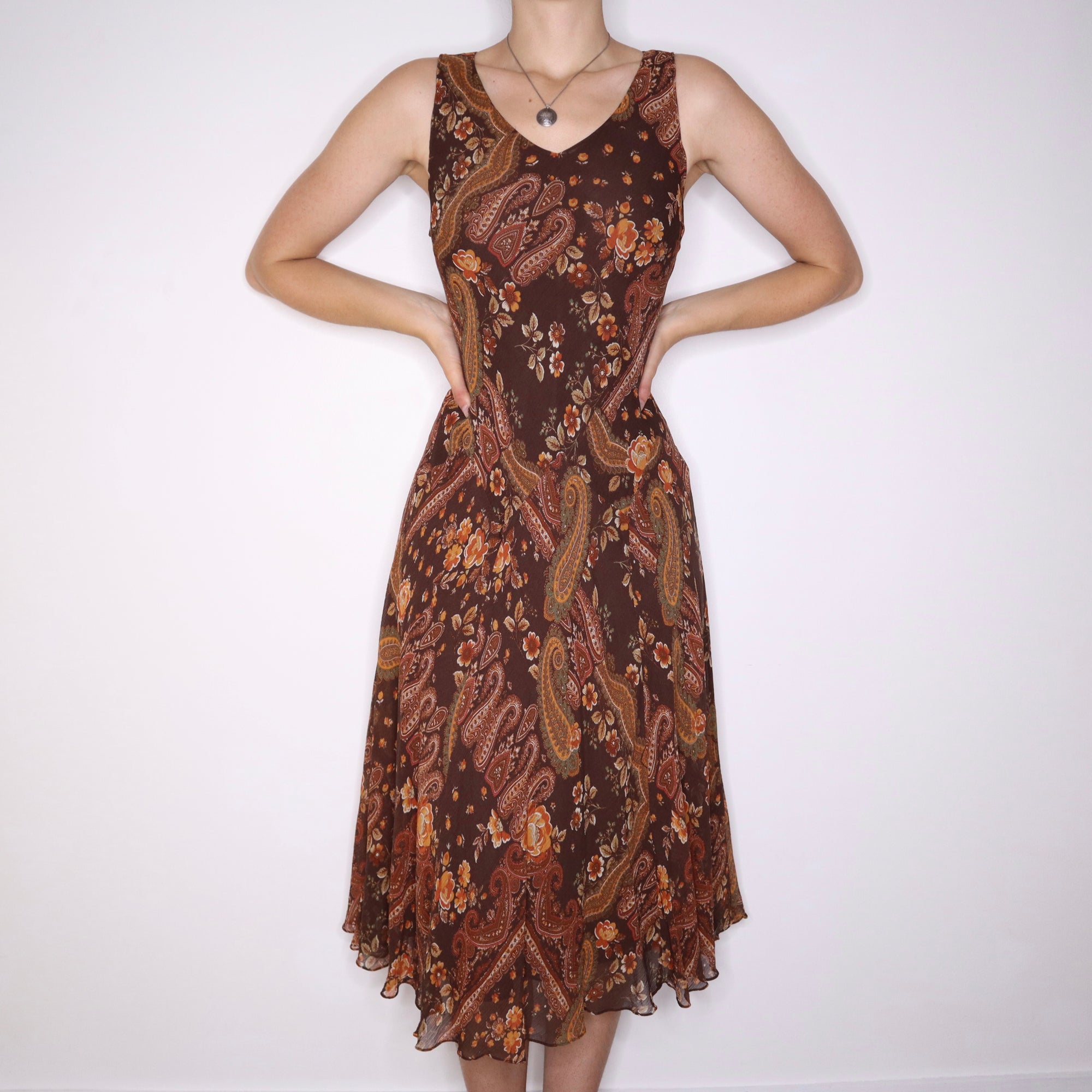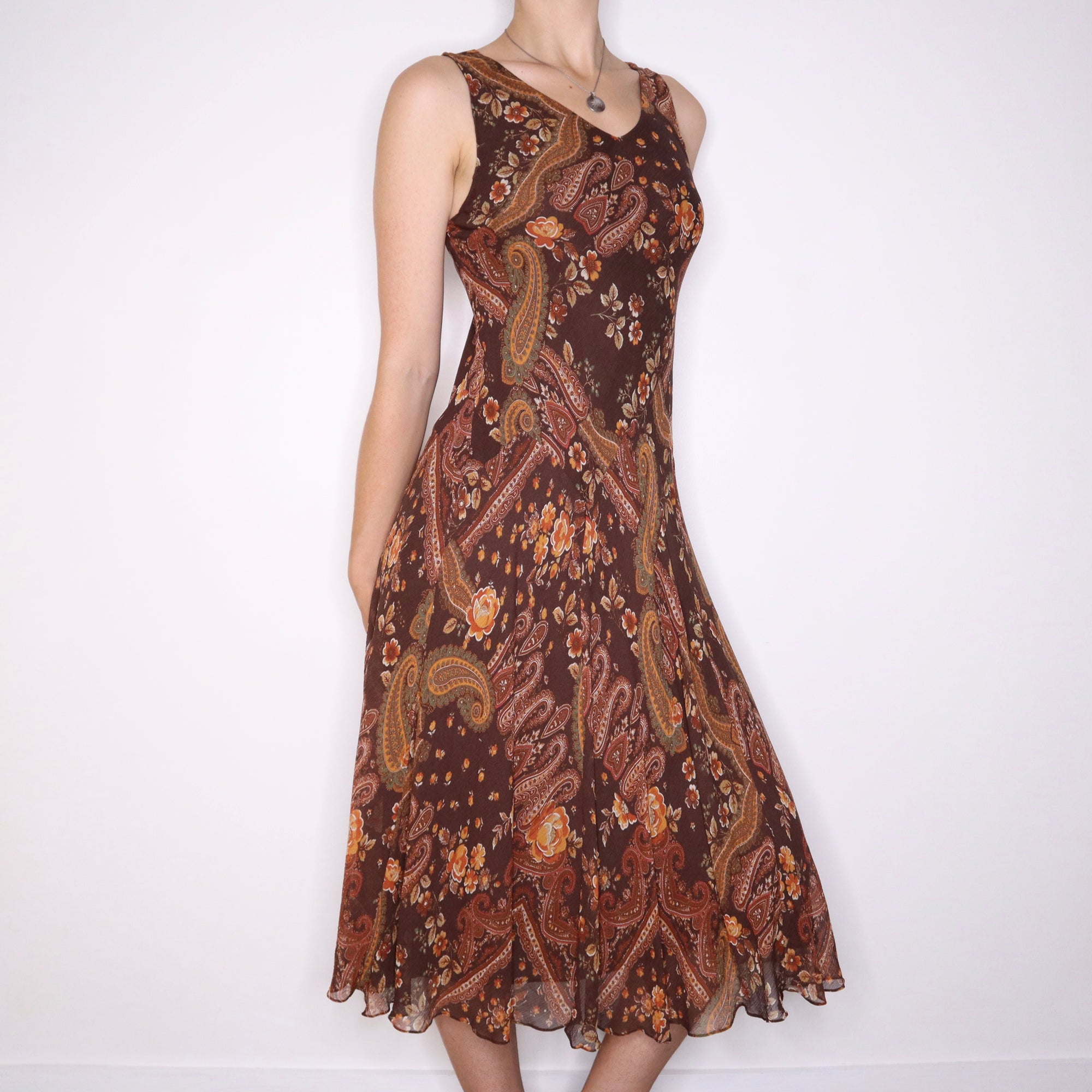 90s Boho Brown Silk Paisley Maxi Dress (M)