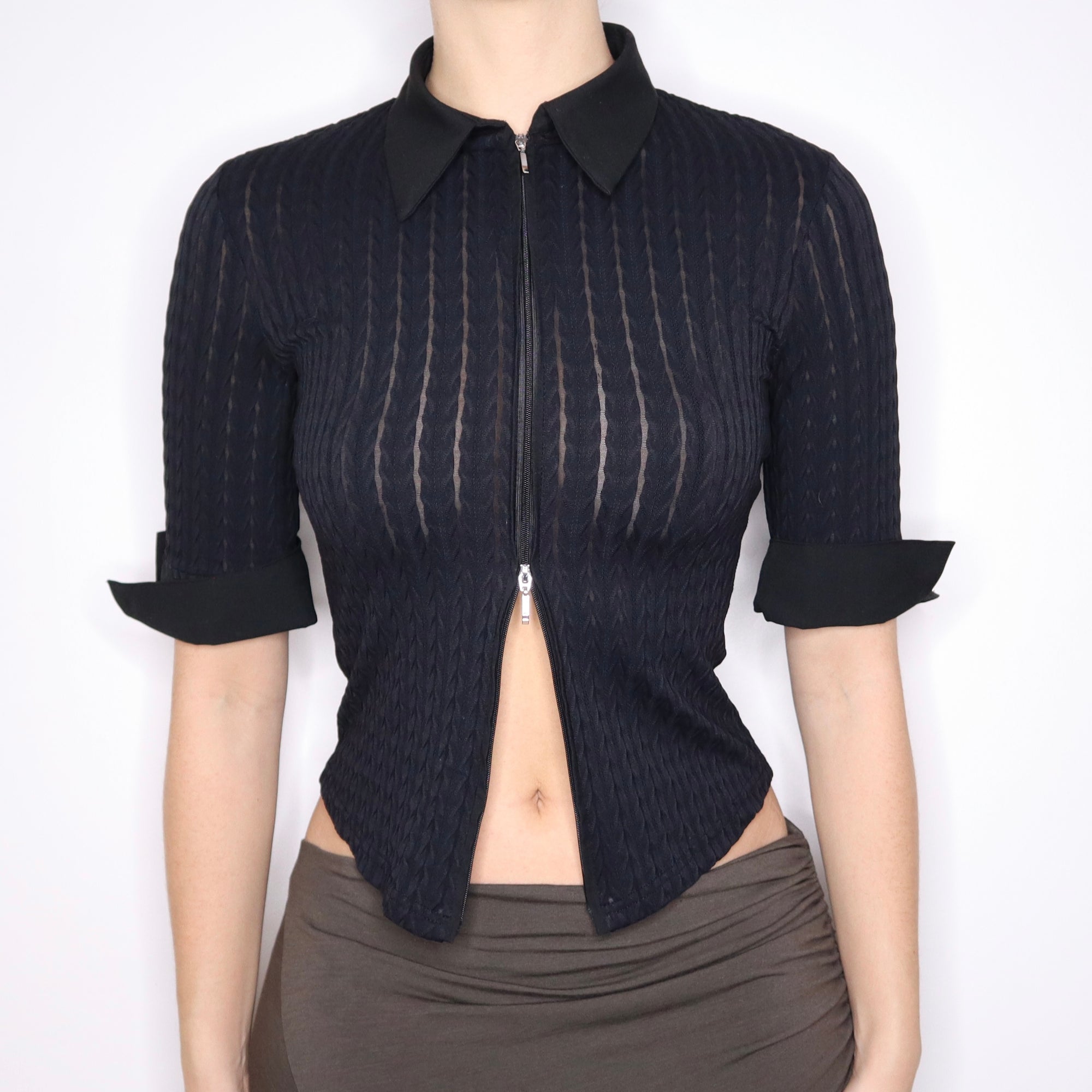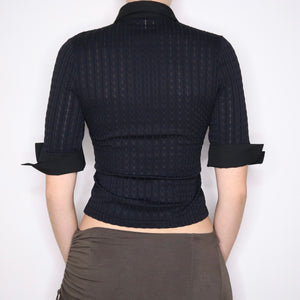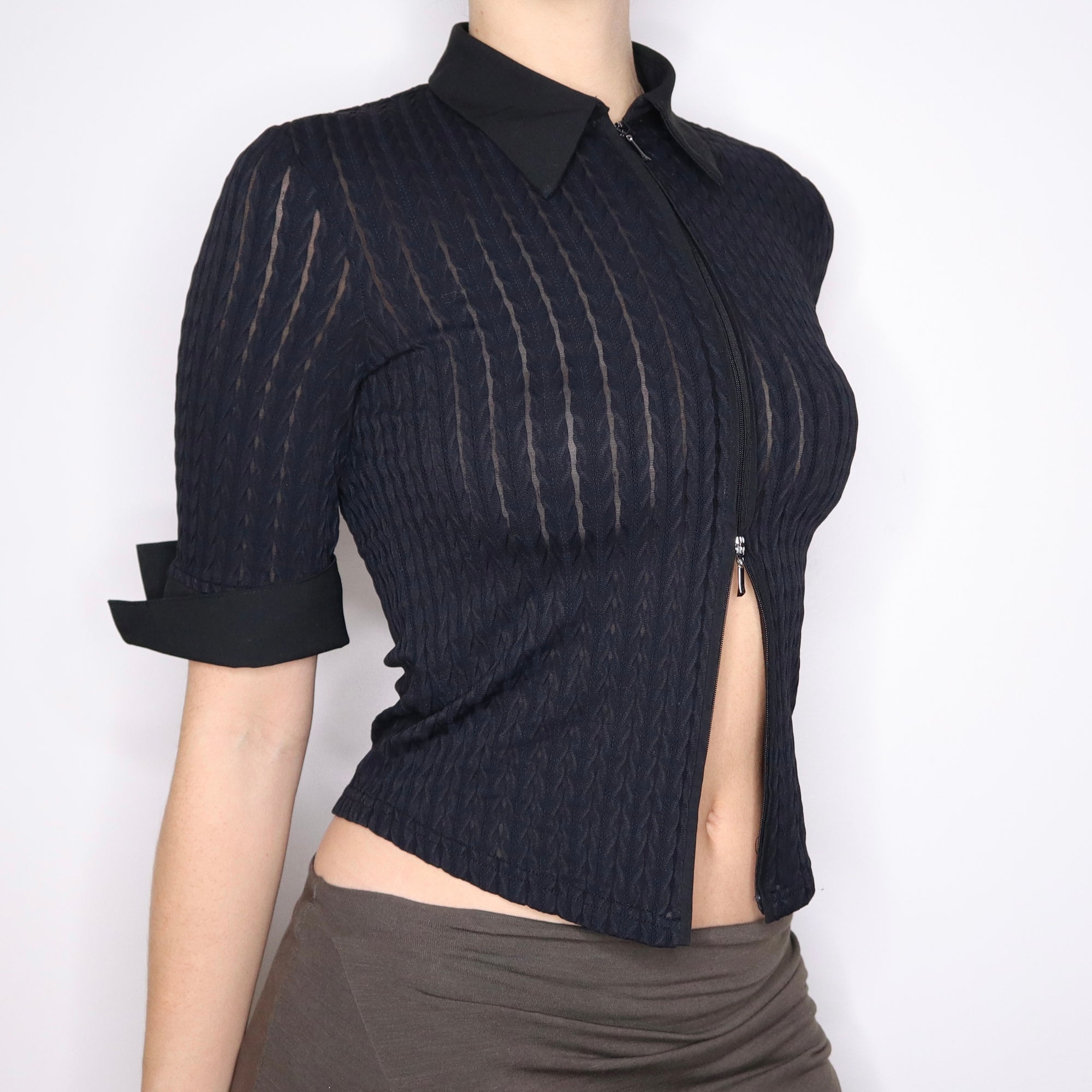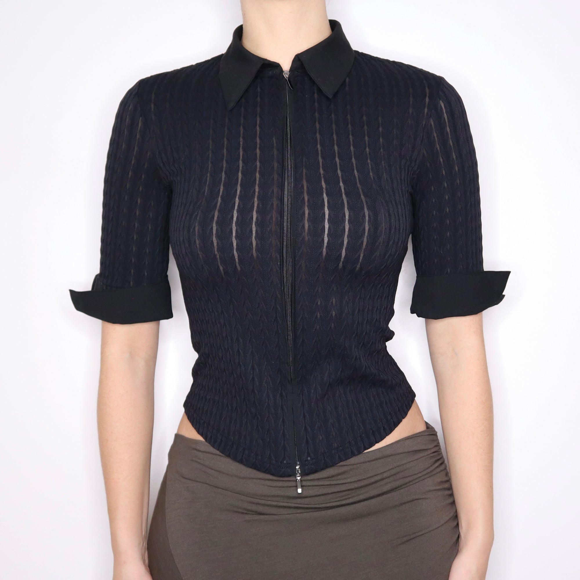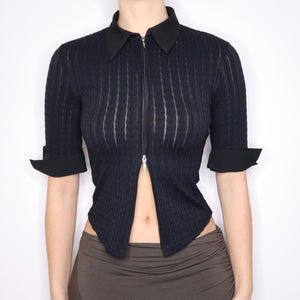 90s French Black Zip Up Blouse (S)