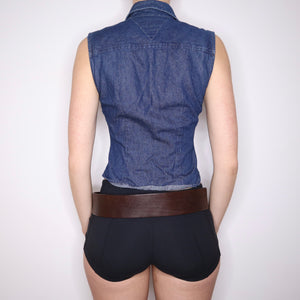 Model is 5’9” and a size S to M. This vest fits well on her.